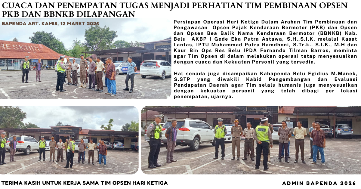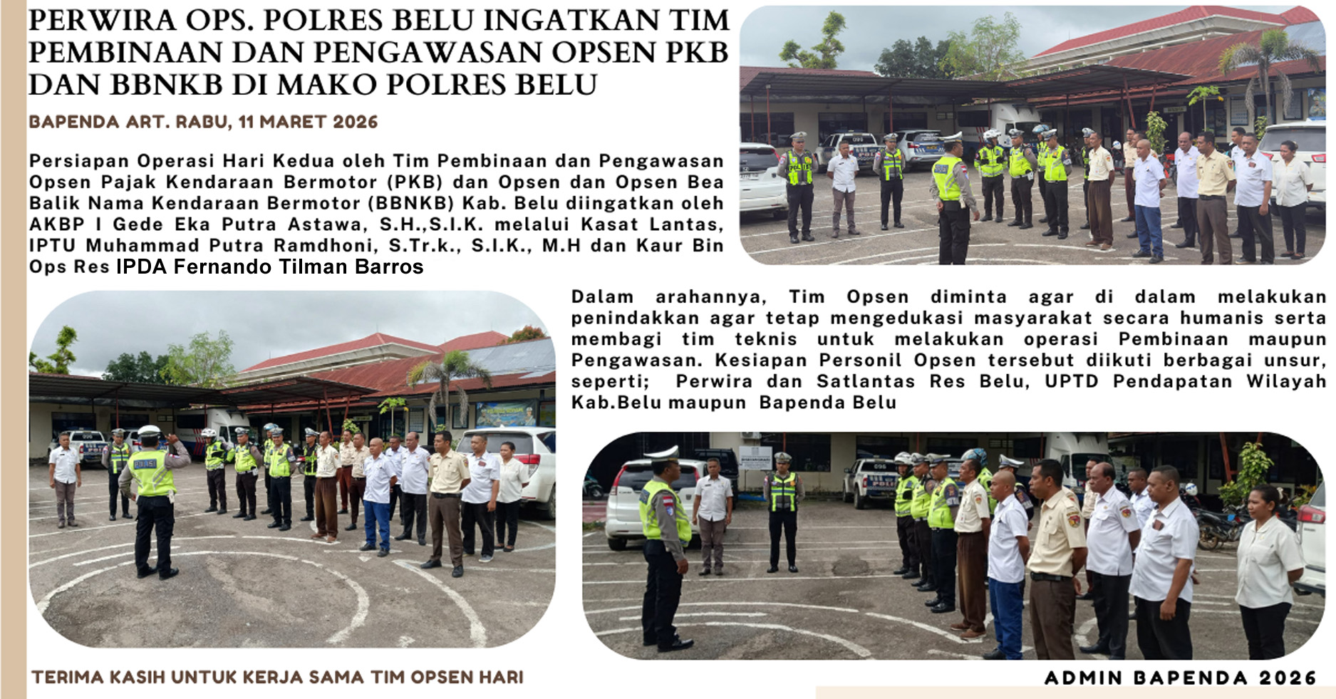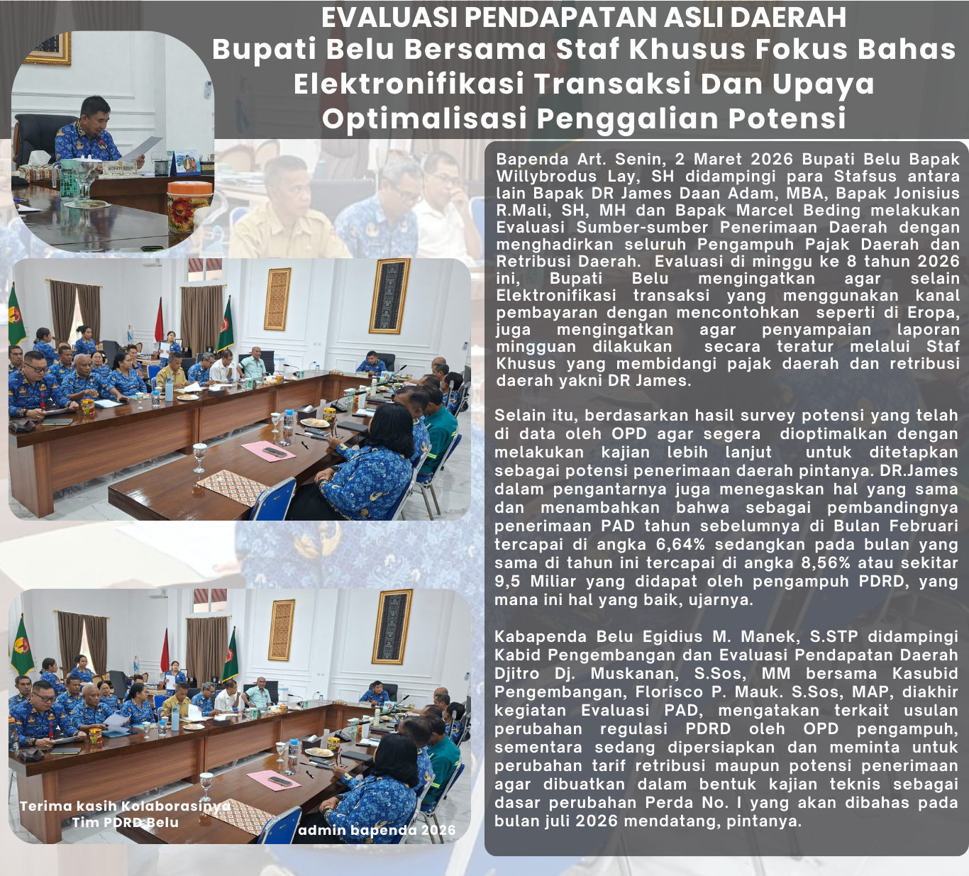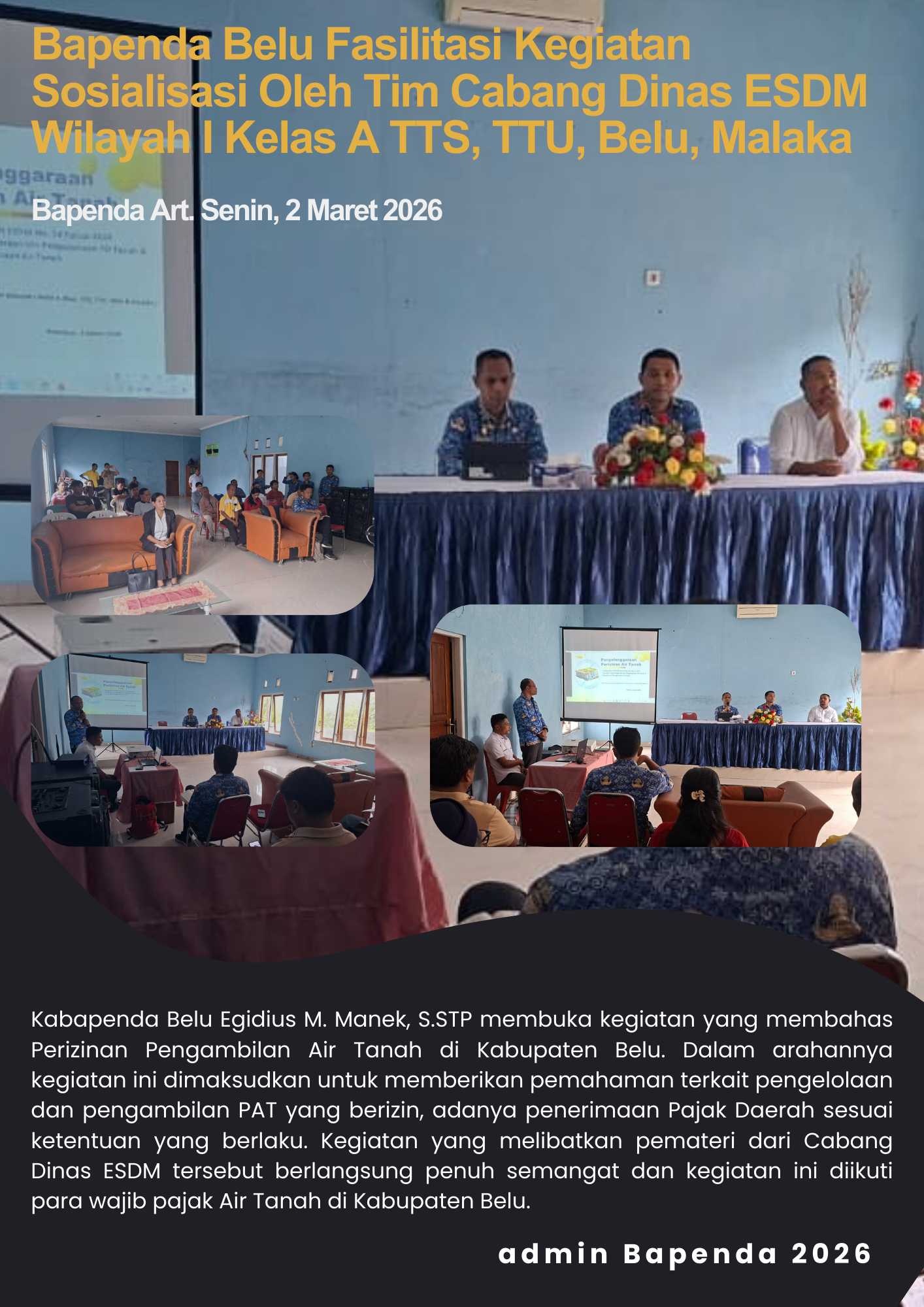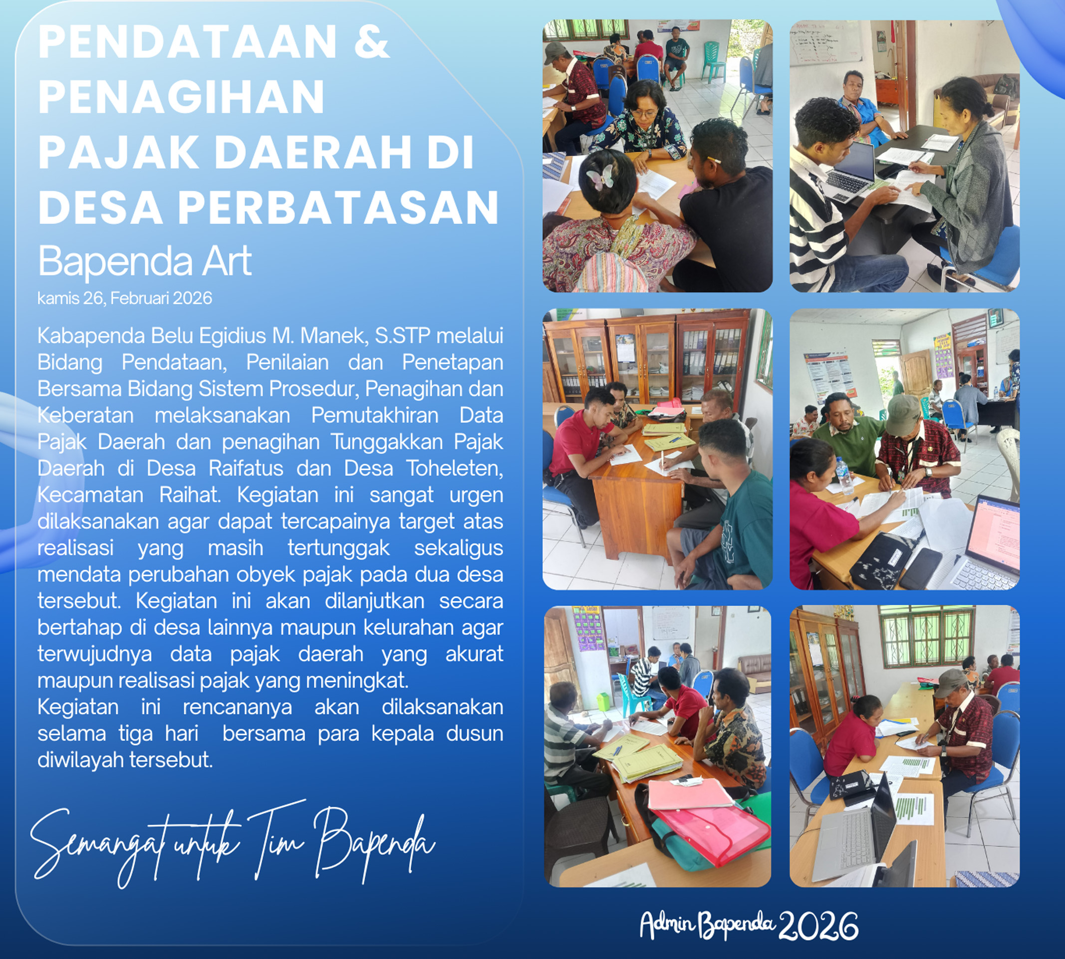 Bapenda Art, Sahabat Pajak Daerah, Komitmen pelayanan pajak di daerah secara santun dan ramah oleh aparatur Bapenda Belu menjadi prioritas dalam mendukung optimalisasi PAD di Kabupaten Belu. Pembinaan dan Pengawasan Pelayanan Pajak Daerah dilakukan oleh kepala Bidang Pengembangan dan Evaluasi Pendapatan Daerah. Terima kasih pelayanan terbaiknya, Bravo tim Bapenda!! (Admin Bapenda 2025)
