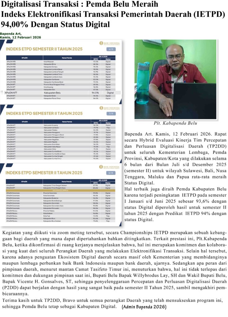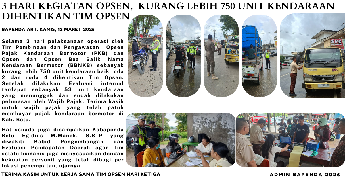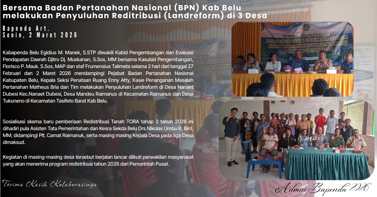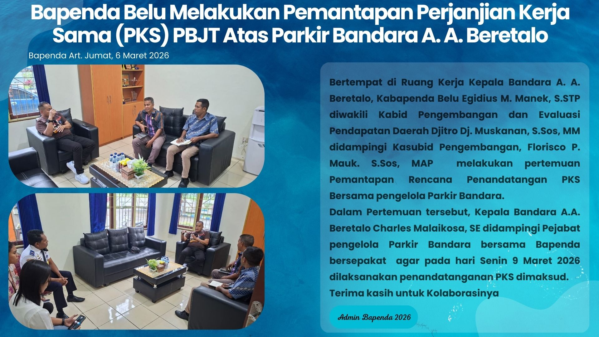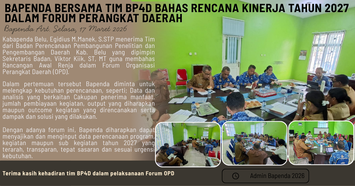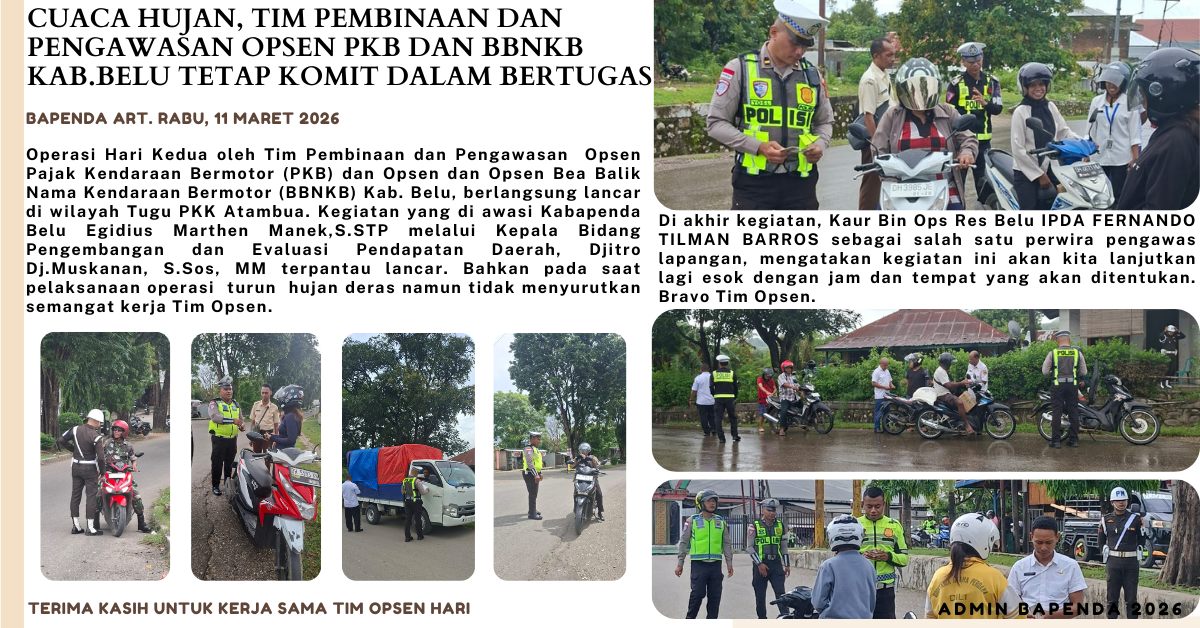 Bapenda Art, Sahabat Pajak Daerah, Komitmen pelayanan pajak di daerah secara santun dan ramah oleh aparatur Bapenda Belu menjadi prioritas dalam mendukung optimalisasi PAD di Kabupaten Belu. Pembinaan dan Pengawasan Pelayanan Pajak Daerah dilakukan oleh kepala Bidang Pengembangan dan Evaluasi Pendapatan Daerah. Terima kasih pelayanan terbaiknya, Bravo tim Bapenda!! (Admin Bapenda 2025)